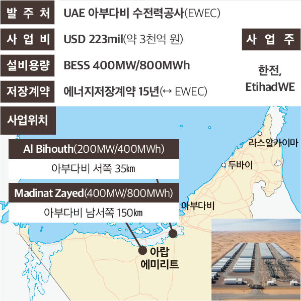 ‘UAE BESS 1’ 사업은 아랍에미리트 아부다비 서쪽 알 비후스(Al Bihouth)와 남서쪽 마디낫 자예드(Madinat Zayed) 두 곳에 각각 출력용량 200MW/저장용량 400MWh, 출력용량 400MW/저장용량 800MWh의 대용량 에너지저장장치(BESS: Battery Energy Storage System1, 2)를 구축하고 향후 15년간 운영하는 총사업비 약 3,000억 원 규모의 프로젝트이다.