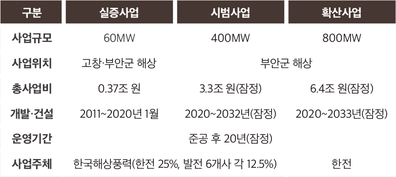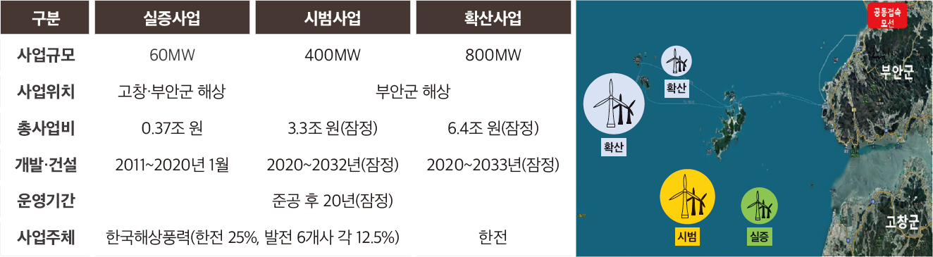 전북 서남권 해상풍력 현황 (2011년 정부 「서남해 해상풍력 2.5GW 종합추진계획」에 따라 개발 중)