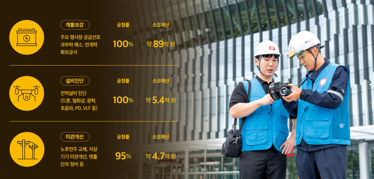 또한 드론·VLF 등 첨단 장비를 활용해 송전선로와 변전소, 배전선로, 지상기기 등 주요 행사장에 전력을 공급하는 8천여 개소의 전력설비 진단·점검도 이뤄졌다. 노후설비 교체와 지상기기 미관개선 작업도 마무리 단계에 접어들었다.