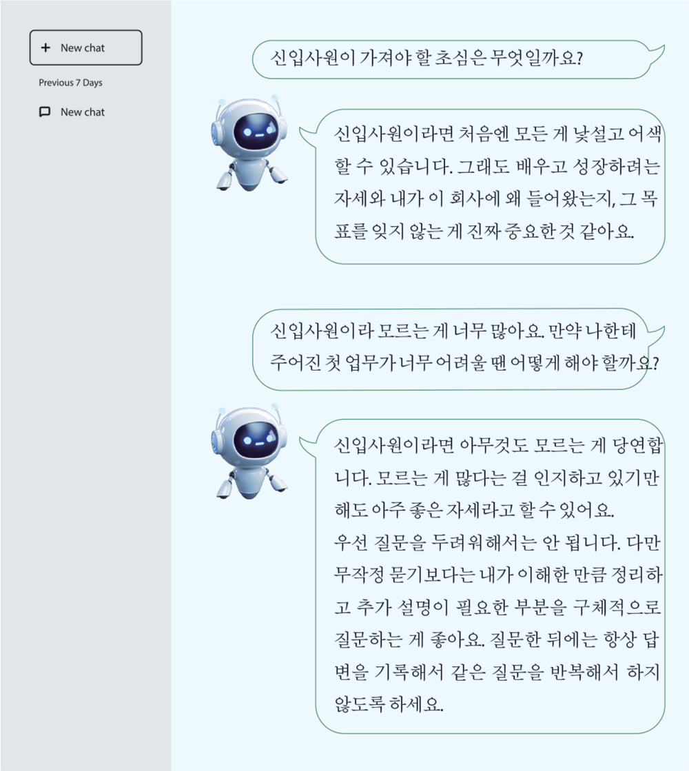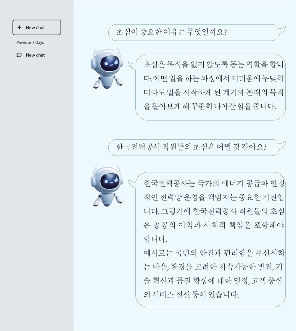 - AI를 마치 인간처럼 대하며 친구와 대화하듯 자연스럽게 ‘초심’을 주제로 이야기를 나눠 보았습니다. 여러 질문을 주고받는 과정에서 회사 선배에게 했던 질문을 똑같이 해보았는데요. 그때 당시 선배가 해준 조언과 비슷한 답변을 해서 놀랐습니다. 인공지능과의 대화를 통해 스스로를 돌아볼 수 있는 시간을 가질 수 있다는 것이 참 신기하네요.