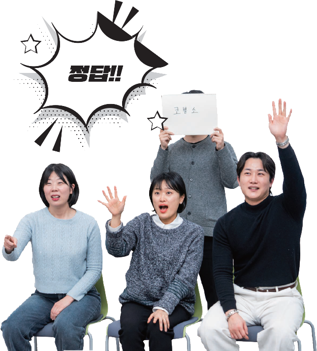 게임의 룰은 간단하다. 각 부서는 문제 주제를 뽑고, 서로가 뽑은 주제에 대해 문제를 출제한다. 총 20문제 중 같은 시간 내에 더 많은 정답을 맞힌 팀이 승리! 각 팀은 서로 의견을 모아 주제를 뽑았다. 경영지원부는 ‘동물’을, 배전운영부는 ‘운동’을 뽑았다. 문제 출제 시간이 주어지자 모두 머리를 맞대고 토론을 시작했다. 시끌벅적한 경영지원부의 상황을 먼저 엿보았다. “진짜 이런 걸 해도 돼?” 최수진 주임이 문제의 난이도를 보고 의문을 가졌다. “이왕 하는 거 이겨야지. 골프는 너무 쉬워서 안 돼.” 이규현 대리가 단호하게 말하며 ‘자이로토닉’을 스케치북에 썼다. 자이로토닉이라니. 생전 처음 보는 단어에 스마트폰으로 검색했더니 배우 송혜교 운동으로 소문난 운동이란다. 무자비한 문제 난이도에 이 사실을 전혀 모르고 있을 배전운영부가 조금 안쓰럽게 보였다. 배전운영부의 상황은 어떨까. 가자마자 보인 글자는 ‘꿩’. 조용하게 문제를 출제하고 있어서 어떤 문제를 내고 있나 궁금했는데 소리 없이 승부욕에 불타오르고 있는 듯했다. 옆에서 가만히 지켜보던 조성천 대리가 “이건 너무 양심 없나요?”라며 눈치를 봤다.